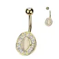 Piercing pour le nombril, en acier chirurgical 316L, plaqué or 14 carats, représentant un cercle serti d'une pierre oeil de chat et de zirconiums baguettes.