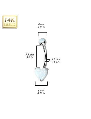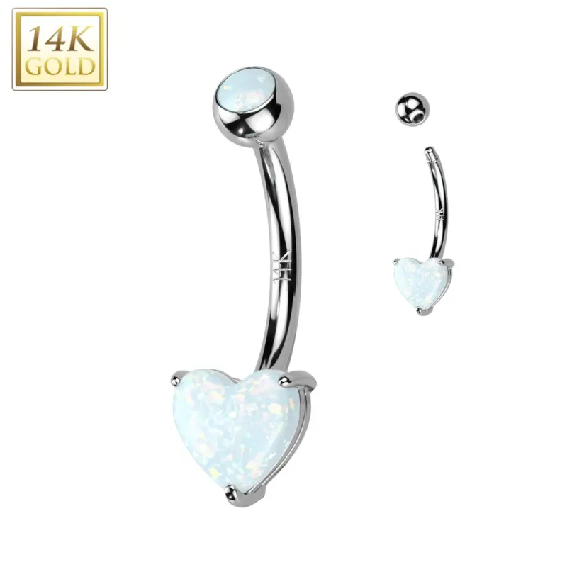 Piercing pour le nombril en véritable or blanc 14 carats, serti de deux pierres en opale de synthèse : l'une à l'intérieur de la boule de fermeture, et la seconde, en forme de coeur.