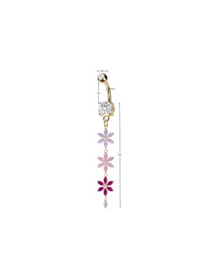 Piercing pour le nombril, en acier chirurgical 316L, plaqué or 14 carats, serti de deux pierres en zirconium blanc, avec un pendentif représentant trois fleurs multicolores.
