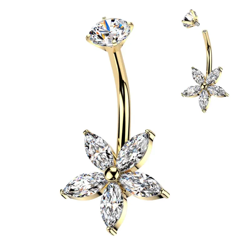 Piercing pour le nombril entièrement réalisé en acier chirurgical 316L, plaqué de couleur dorée et serti de zirconiums marquise représentant une fleur.