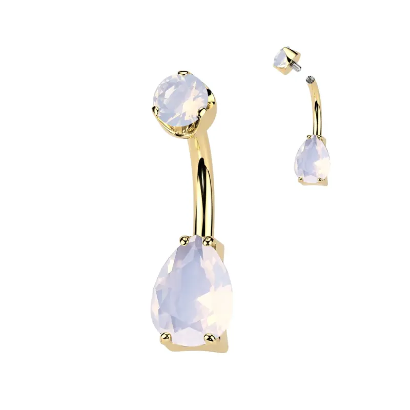 Piercing de nombril entièrement réalisé en titane de grade ASTM F-136, plaqué de couleur dorée et serti d'une pierre naturelle de quartz rose sculptée en forme de larme.