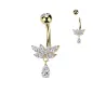 Piercing pour nombril en titane de grade ASTM F136, plaqué de couleur dorée, et serti de pierres marquise formant un éventail, et un pendentif zirconium en forme de larme.