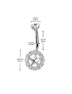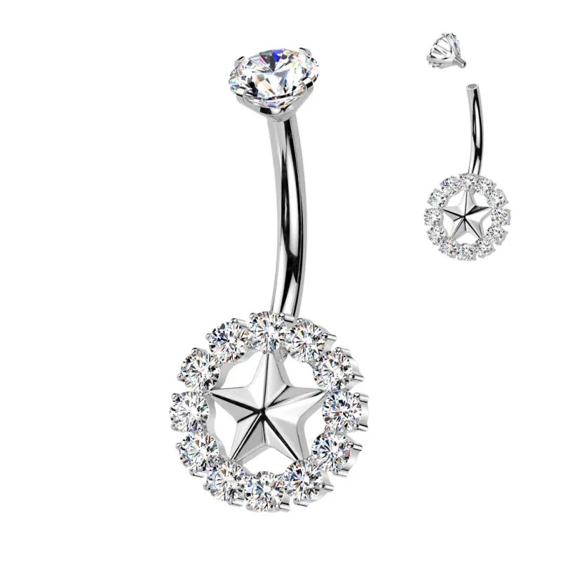 Sublimez votre nombril avec ce piercing en titane orné d’une étoile élégante, entourée de zircons étincelants. Hypoallergénique, résistant et ultra-brillant.