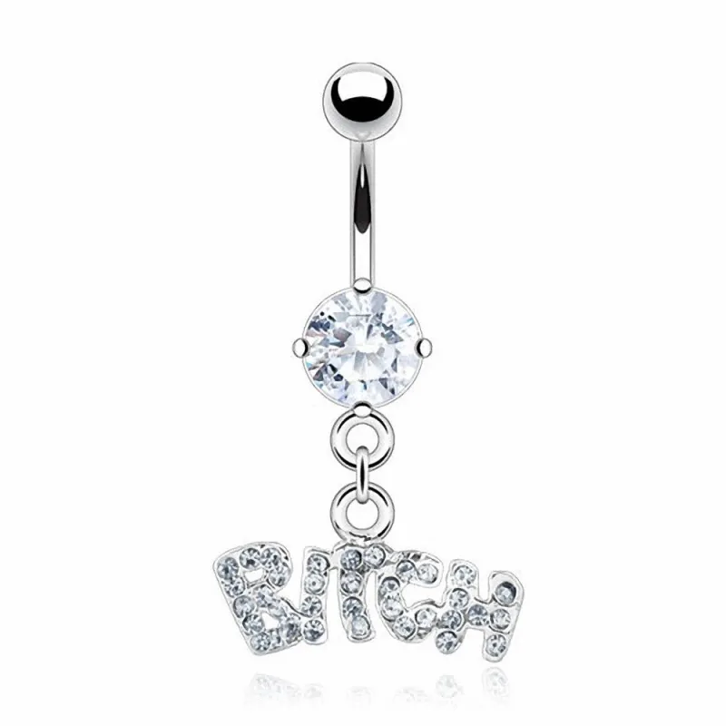 Piercing pour nombril avec pendentif représentant le mot "bitch".