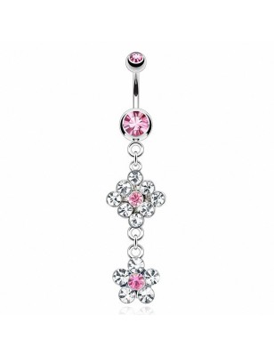 Piercing pour le nombril, en acier chirurgical 316L, serti de deux pierres en zircon, avec un pendentif représentant deux fleurs, serties de multiples gemmes.