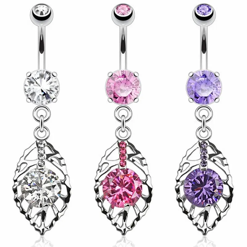 Piercing pour le nombril, en acier chirurgical 316L, serti de deux pierres en zircon, avec un pendentif représentant une feuille avec un gemme rond.