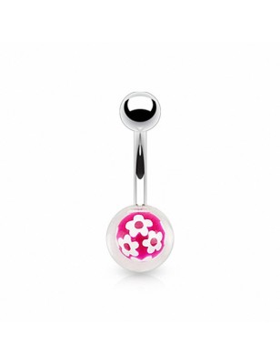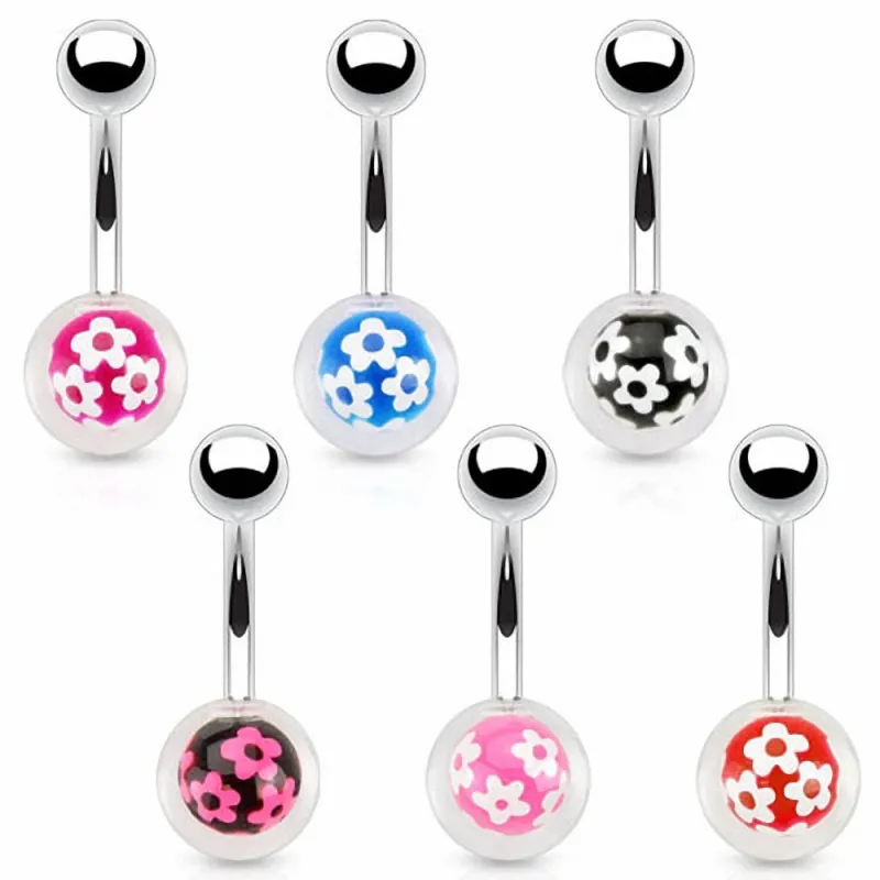 Piercing pour le nombril en acier chirurgical 316L, représentant des fleurs à l'intérieur d'une boule en acrylique claire.