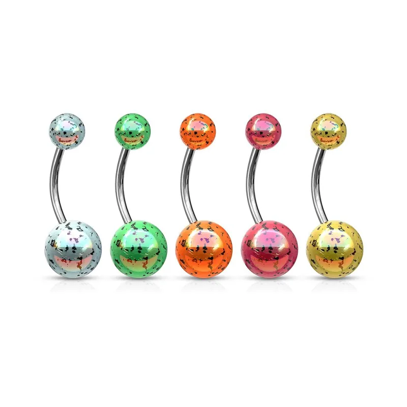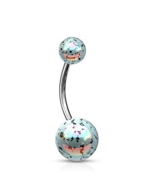 Piercing pour le nombril en acier chirurgical 316L, avec deux boules en acrylique représentant des tâches, avec un aspect aurore boréale.