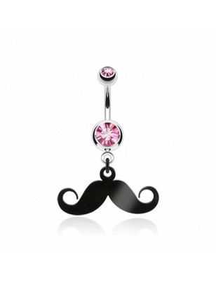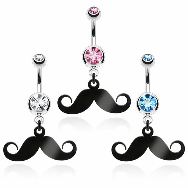 Piercing pour le nombril, en acier chirurgical 316L, serti d'une pierre en zircon, avec un pendentif représentant une moustache noire.