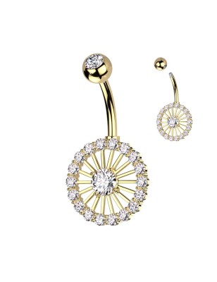 Piercing de type banane pour le nombril, en acier plaqué or, serti de plusieurs pierres en zircon de couleur claire, formant une fleur de dahlia.