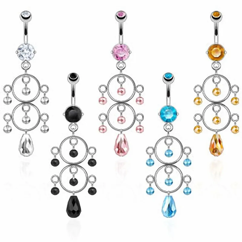 Piercing de type banane pour le nombril, en acier chirurgical, serti d'une pierre en zircon, avec un pendentif représentant deux cercles et des perles.