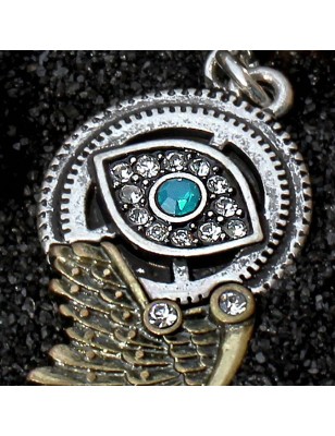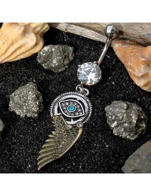 Piercing pour le nombril, en acier chirurgical, avec un pendentif représentant un oeil ainsi qu'une aile d'inspiration Steampunk.