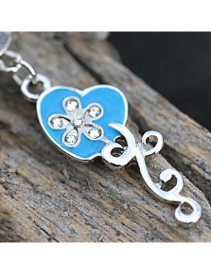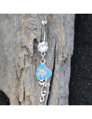 Piercing de type banane, pour le nombril, en acier chirurgical 316L, sertie d'une pierre en zirconium clair, avec un pendentif représentant un coeur bleu ainsi qu'une fleur.