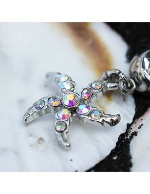 Piercing de type banane, pour le nombril, en acier chirurgical 316L, sertie d'une pierre en zirconium clair, avec un pendentif représentant une étoile de mer pavée de strass couleur aurore boréale.