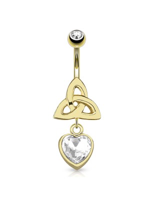 Piercing de type banane pour le nombril, en acier chirurgical, plaqué or 14K, serti d'une pierre en zirconium claire, avec un pendentif représentant un noeud celtique, ainsi qu'une pierre en forme de coeur.