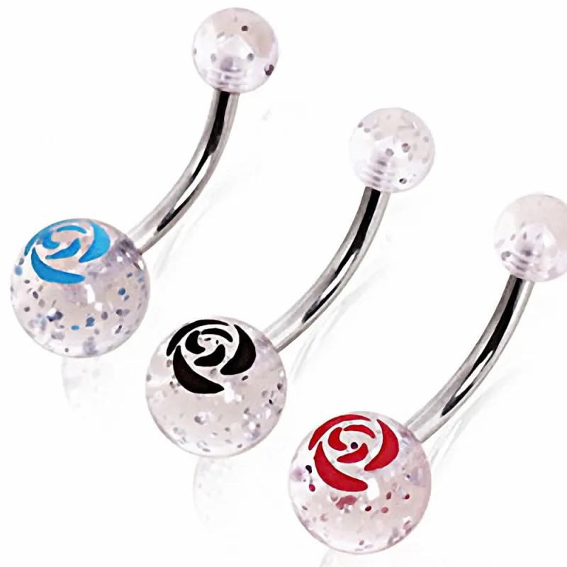 Piercing pour nombril avec des boules en acrylique pailletées, représentant une rose.