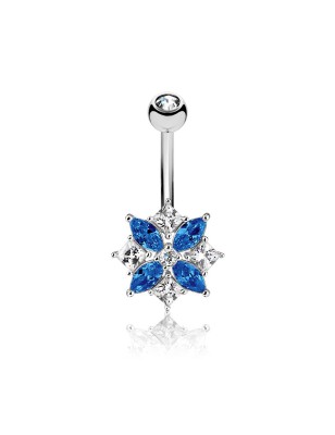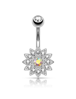 Piercing de type banane pour le nombril, en acier chirurgical 316L, représentant une petite fleur serti d'un cristal de couleur rose.