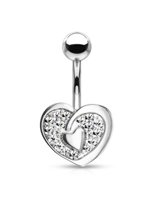 Piercing de type banane, pour le nombril, en acier chirurgical 316L, représentant un coeur pavé de multiples pierres en zirconium blanches.