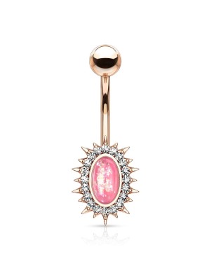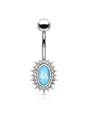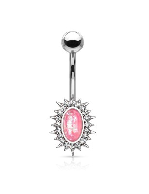 Piercing de type banane, pour le nombril, en acier chirurgical 316L, représentant un soleil serti d'une pierre en résine imitation opale de couleur blanche.