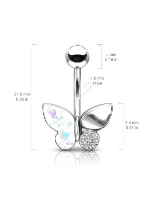 Piercing de type banane, pour le nombril, en acier chirurgical 316L, représentant un papillon avec une aile sertie de pierre en résine imitation opale de couleur blanche, et une autre sertie de petits cristaux.