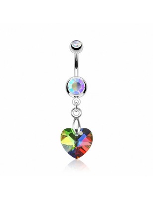 Piercing en acier chirurgical de type "banane" pour le nombril, serti de deux pierres Cubic Zirconium, avec un pendentif en forme de coeur, représentant un prisme de cristal.