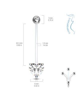 Ce piercing se compose d'une barre en bioflex, d'une bille en acier chirurgical serti d'un strass, et d'une large pierre en forme de coeur en zirconium blanc de 8 mm de diamètre.