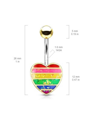 Piercing de type banane, pour le nombril, en acier chirurgical 316L, représentant un coeur doré, serti de pierre en résine imitation opale multicolore.