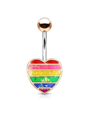 Piercing de type banane, pour le nombril, en acier chirurgical 316L, représentant un coeur argenté, serti de pierre en résine imitation opale multicolore.