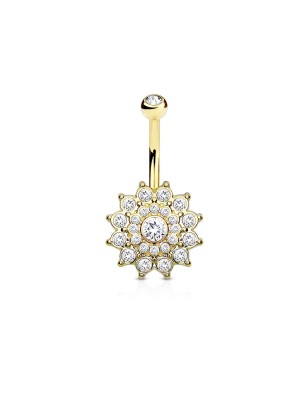 Piercing de type labret, pour le cartilage de l'oreille et l'hélix, en acier chirurgical 316L, plaqué or 14 carats, représentant une feuille pavée de petites pierres en zirconium blanc.