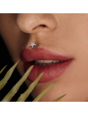 Piercing de type labret, pour le cartilage de l'oreille et l'hélix, en acier chirurgical 316L, représentant une fleur sertie de pierres en zirconium.