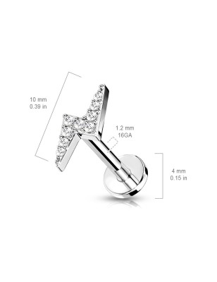 Piercing de type labret, pour le cartilage de l'oreille et l'hélix, en acier chirurgical 316L, représentant un éclair pavé de petites pierres en zirconium blanc.