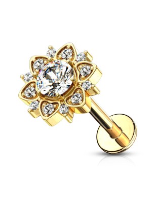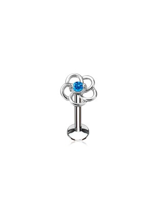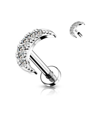 Piercing de type labret, pour le cartilage de l'oreille et l'hélix, en acier chirurgical 316L, représentant un coeur dont la moitié est pavée de petites pierres blanches.