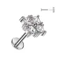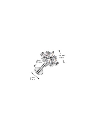 Piercing labret pour l'oreille (cartilage, hélix), en acier chirurgical 316L, avec embout push-in (sans vissage) serti de 4 zirconiums de forme carrée.