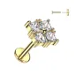 Piercing labret pour l'oreille (cartilage, hélix), en acier chirurgical 316L plaqué de couleur dorée, avec embout push-in (sans vissage) serti de 4 zirconiums de forme carrée.