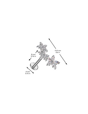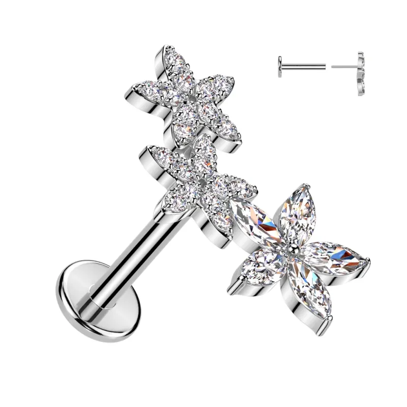 Piercing labret pour l'oreille (cartilage, hélix), en acier chirurgical 316L, avec embout push-in (sans vissage) représentant trois fleurs serties de strass.