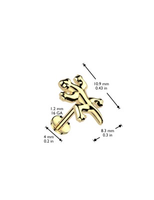 Piercing labret pour l'oreille, en titane de grade ASTM F136 plaqué de couleur dorée, avec embout à vissage interne représentant un gecko.