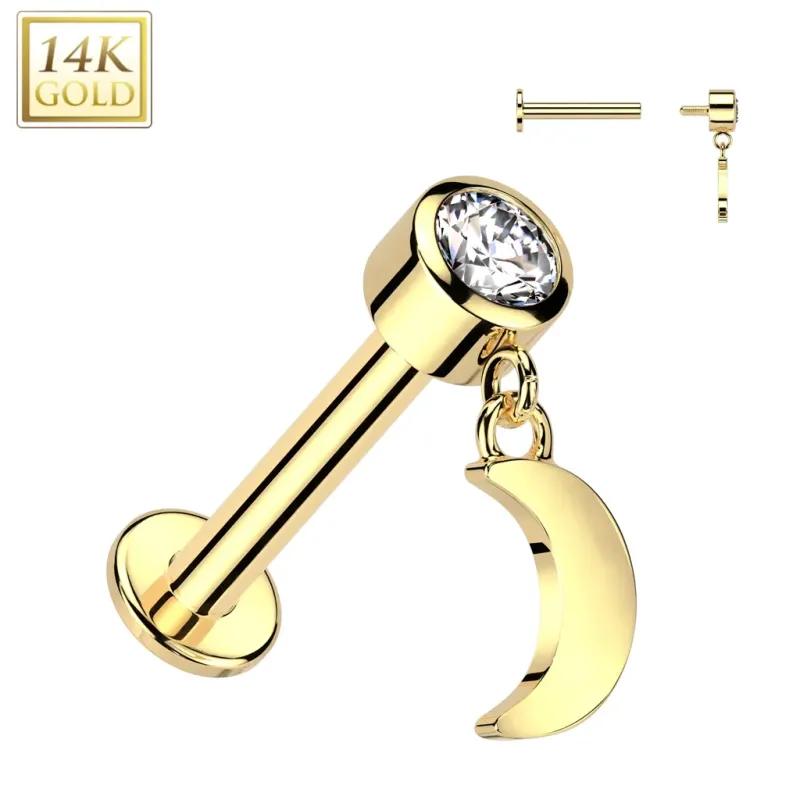Piercing labret, pour l'oreille (hélix, cartilage), en véritable or jaune 14 carats. L'embout à vissage interne est serti d'un zirconium et s'accompagne d'un pendentif représentant un croissant de lune.