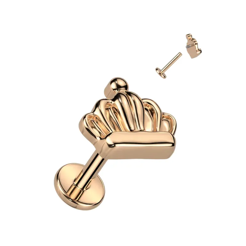 Piercing labret pour l'oreille, en titane de grade ASTM F136 plaqué de couleur cuivrée, avec embout à vissage interne représentant une couronne.