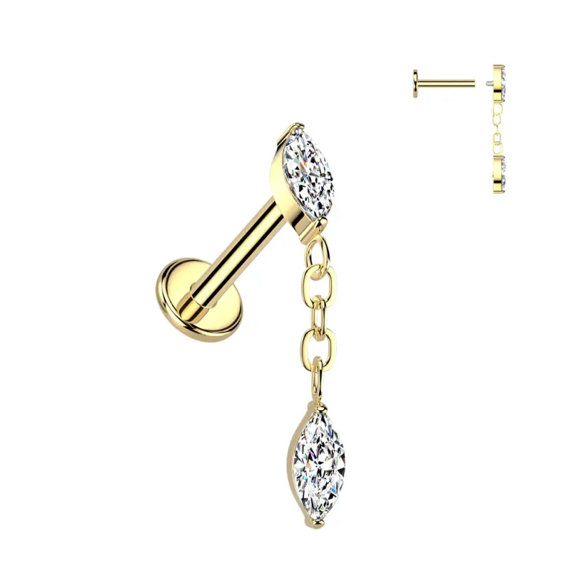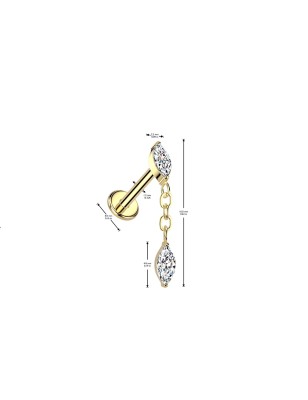 Piercing labret pour l'oreille (hélix), en titane de grade ASTM F136 plaqué de couleur dorée, avec embout à vissage interne serti d'un zircon forme marquise et d'un pendentif reliant un second zirconium marquise.