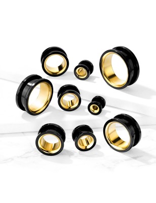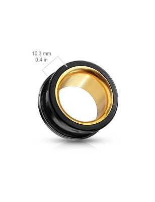 Piercing de type tunnel, pour l'élargissement du lobe de l'oreille, en acier chirurgical 316L, recouvert d'un placage par PVD de couleur noire et dorée.