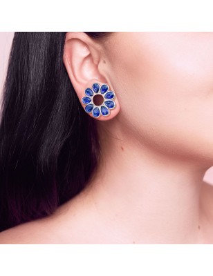 Piercing de type tunnel pour élargissement du lobe de l'oreille, en acier chirurgical 316L, représentant une fleur sertie de pierres en zirconium de couleur bleue.