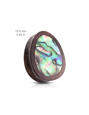 Piercing plug, pour le lobe de l'oreille, en bois de sono, en forme de larme, avec de la nacre insérée.