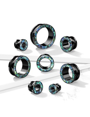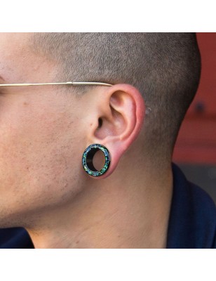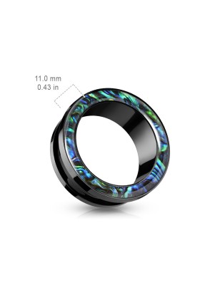 Piercing de type tunnel pour élargissement du lobe de l'oreille, en acier chirurgical 316L, avec placage noir par technique PVD, ainsi que de la nacre abalone sur tout le pourtour du tunnel.