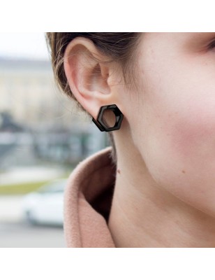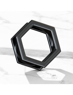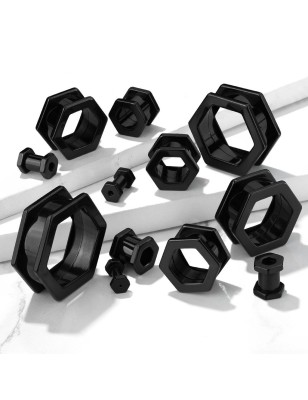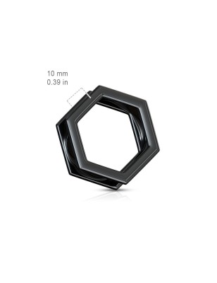 Piercing de type tunnel pour élargissement du lobe de l'oreille, en acier chirurgical 316L, avec placage de couleur noire, de forme hexagonale.
