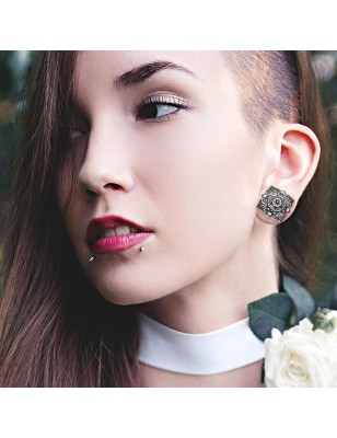 Piercing tunnel pour oreille en acier chirurgical, représentant un motif floral.