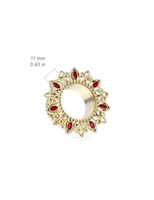 Piercing de type tunnel pour élargissement du lobe de l'oreille, en acier chirurgical 316L, plaqué de couleur dorée, représentant une fleur de lotus serti de zircon rouge.