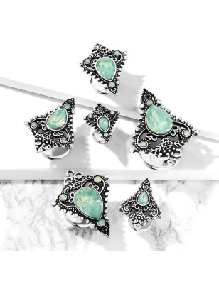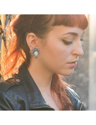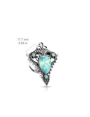 Piercing tunnel, pour l'élargissement du lobe d'oreille, en acier chirurgical, avec un motif représentant un bouclier tribal serti d'une pierre en forme de larme, en cristal opalescent couleur jade.