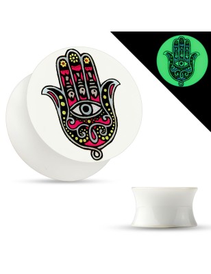 Piercing plug pour le lobe de l'oreille, en acrylique phosphorescent dans le noir, représentant un crâne.