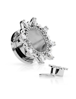 Piercing de type tunnel, pour l'élargissement du lobe d'oreille, en acier chirurgical, serti de multiples gemmes sur tout le contour.