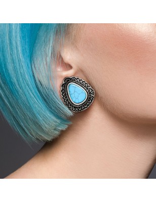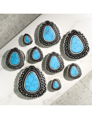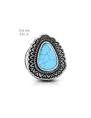 Piercing de type tunnel pour élargissement du lobe de l'oreille, en acier chirurgical 316L, représentant une larme sertie d'une pierre en turquoise de synthèse.